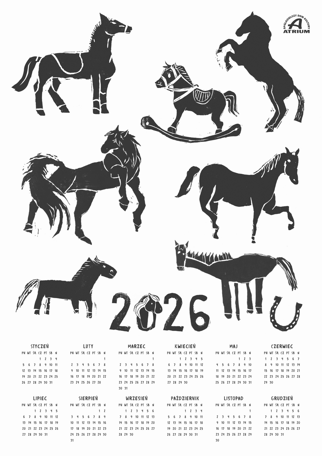 2026 – chiński rok Ognistego Konia. Życie nabierze dynamizmu, intensywności, szalonego tempa. Choć mamy nadzieję, że przynajmniej miłe chwile z galopu zwolnią do stępa, byśmy zdążyli się nimi nacieszyć. Zachęcamy do pobrania kalendarza wykonanego przez dzieci uczęszczające na zajęcia graficzne organizowane przez nasz dom kultury prowadzone przez Agnieszkę Matwiejszyn. Tematycznie nawiązuje on do kalendarza chińskiego, przedstawia wizerunki koni powstałe w technice linorytu. Jest to bardzo pracochłonna technika, wymagająca skupienia i niezwykłej cierpliwości, za to efekt pracy, jak widać, potrafi być efektowny.